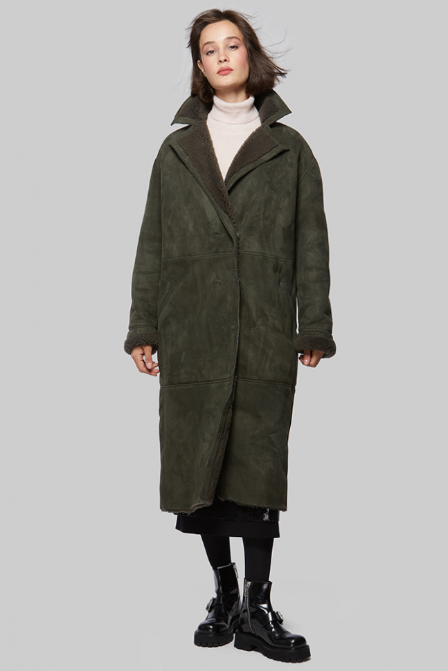 Дубленка из бархатистой испанской овчины с густым плотным мехом. Двубортная застежка на кнопки, широкий отложной воротник с кантом по краю, как у дубленки Анук Эме из фильма «Мужчина и женщина». Прямой, слегка овальный силуэт дубленки позволяет сочетать ее с любым низом — широкими джинсами, юбкой миди или классическими брюками. Тон в тон к цвету дубленки мы можем подобрать наши аксессуары из 100% кашемира.